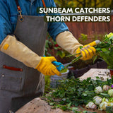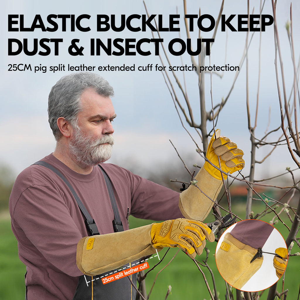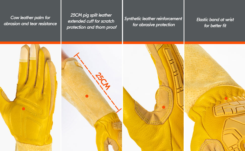 - 3. EXTRA KNUCKLE GUARD FOR ANTI-ABRATION: Your project was tougher than you thought it was going to be, but not as tough as explaining your bloody knuckles. Flexible Thermal Plastic Rubber TPR knuckle guard helps reduce the risk of impact and pinching injuries. Extra-long split pig leather cuff design with high tear-resistance and puncture resistance level to protect forearms from scratches, poke or harm. Long pruning gloves allowing you free from your roses painlessly.